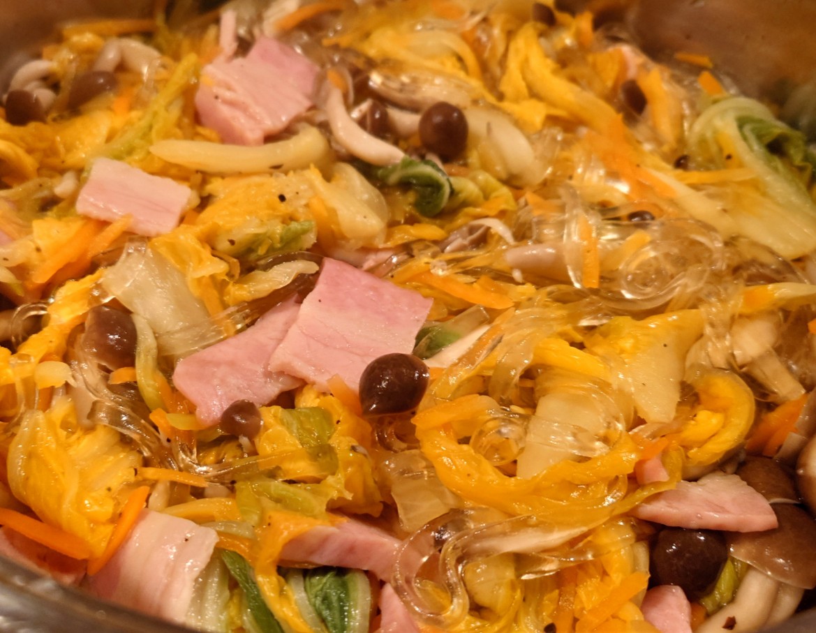 オレンジ白菜の葉先の軟らかい所としめじ、ベーコンを野菜から出た水分のみで煮て鶏がらと塩で味付け、葛切りでまとめました。普通に美味しいです。¥300