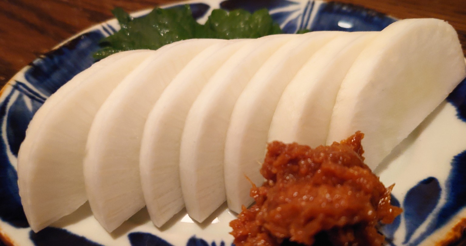 岸和田産の新鮮な冬大根です。とても瑞々しくて食べていると思わず『果物だった?』となります。特製香味野菜味噌󠄀をつけてどうぞ。¥300